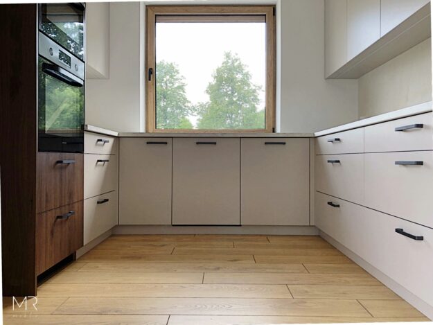 Realizacja kuchni w domku pod miastem. Połączenie drewna i kaszmiru, to moda która nie przemija. Elegancki projekt i funkcjonalne systemy spełniły oczekiwania bardzo wymagających klientów. blat Pfleiderer Marmur Calacatta S63054 VV dekory płyt meblowych Pfleiderer: Cashmere U12168 i Orzech Okapi R30135 kosz Cargo Maxi FGV 6-poziomowy 300mm antracytowy