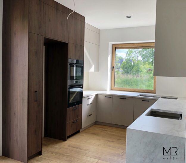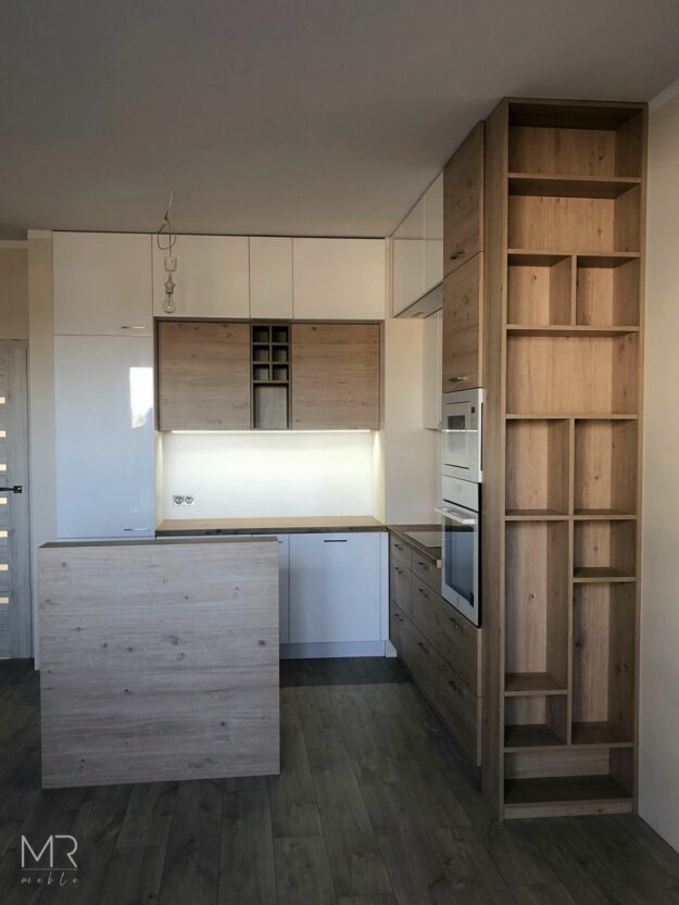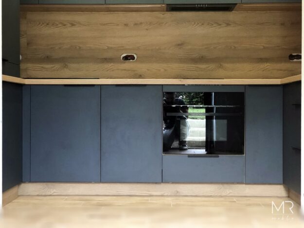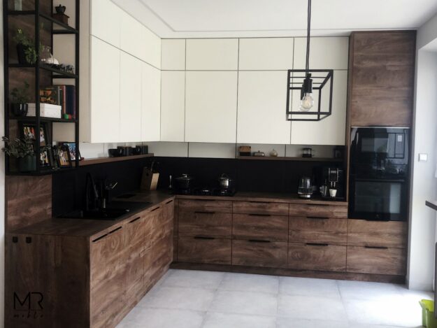 Kawalerka w piwnicy. Cegła na ścianie, antracyt i czerń w kuchni przełamane kolorem dębu. Znalazło się w niej miejsce dla pralki, niewielkiej lodówki i całkiem sporo miejsca dzięki szafkom narożnym i systemom szuflad. płyty laminowane Swiss Krono: D4033 Dąb słoneczny i U164 VL Antracyt blat D4033 OV Dąb słoneczny szuflady GTV Axis Pro antracytowe