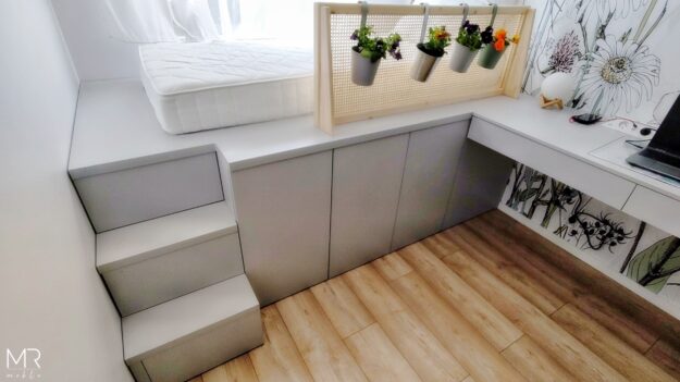 Kawalerka w piwnicy. Cegła na ścianie, antracyt i czerń w kuchni przełamane kolorem dębu. Znalazło się w niej miejsce dla pralki, niewielkiej lodówki i całkiem sporo miejsca dzięki szafkom narożnym i systemom szuflad. płyty laminowane Swiss Krono: D4033 Dąb słoneczny i U164 VL Antracyt blat D4033 OV Dąb słoneczny szuflady GTV Axis Pro antracytowe